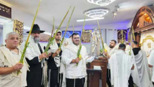 ר' בן ציון חי בורוכוב בסוכתו בתל אביב מתפללי בית הכנסת אלי בעזרי בתל כביר במהלך הושענות וחיבוט הערבה רבה הראשי של הקהילה הבוכרית באוזבקיסטן